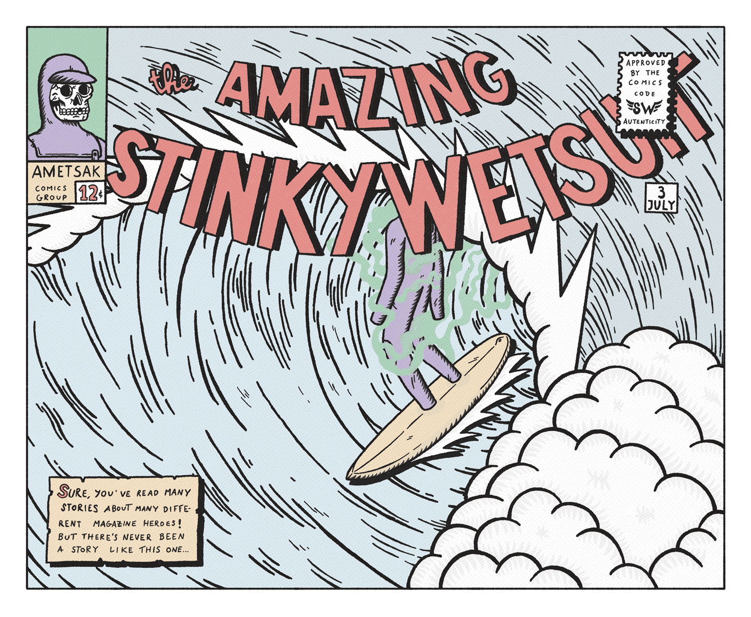 I had the pleasure to create a short comic about Stinky Wetsuit, a singular hero that fights for the balance in the line up while surfing. Work commissioned by my good friend Gorka for his illustrated book Ametsak. A book of X pages illustrated by different artists from all over the world.