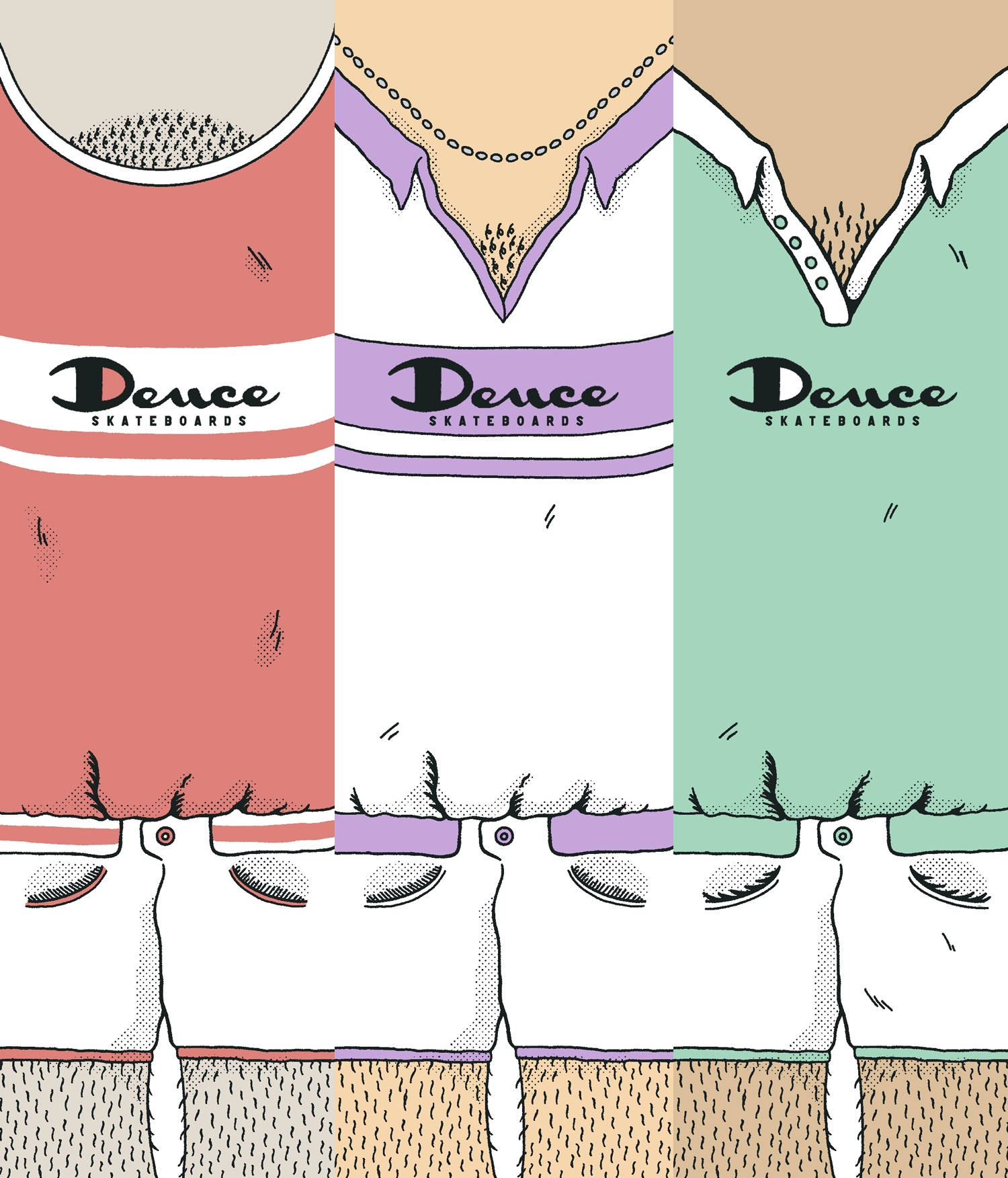 Deuce Deck graphics for Deuce Skateboarding. My idea was to give it an 80s tennis theme, players in tight uniforms, afro hair and crazy moves. Cantabria / 2022 ← Previous Next → Back to Works