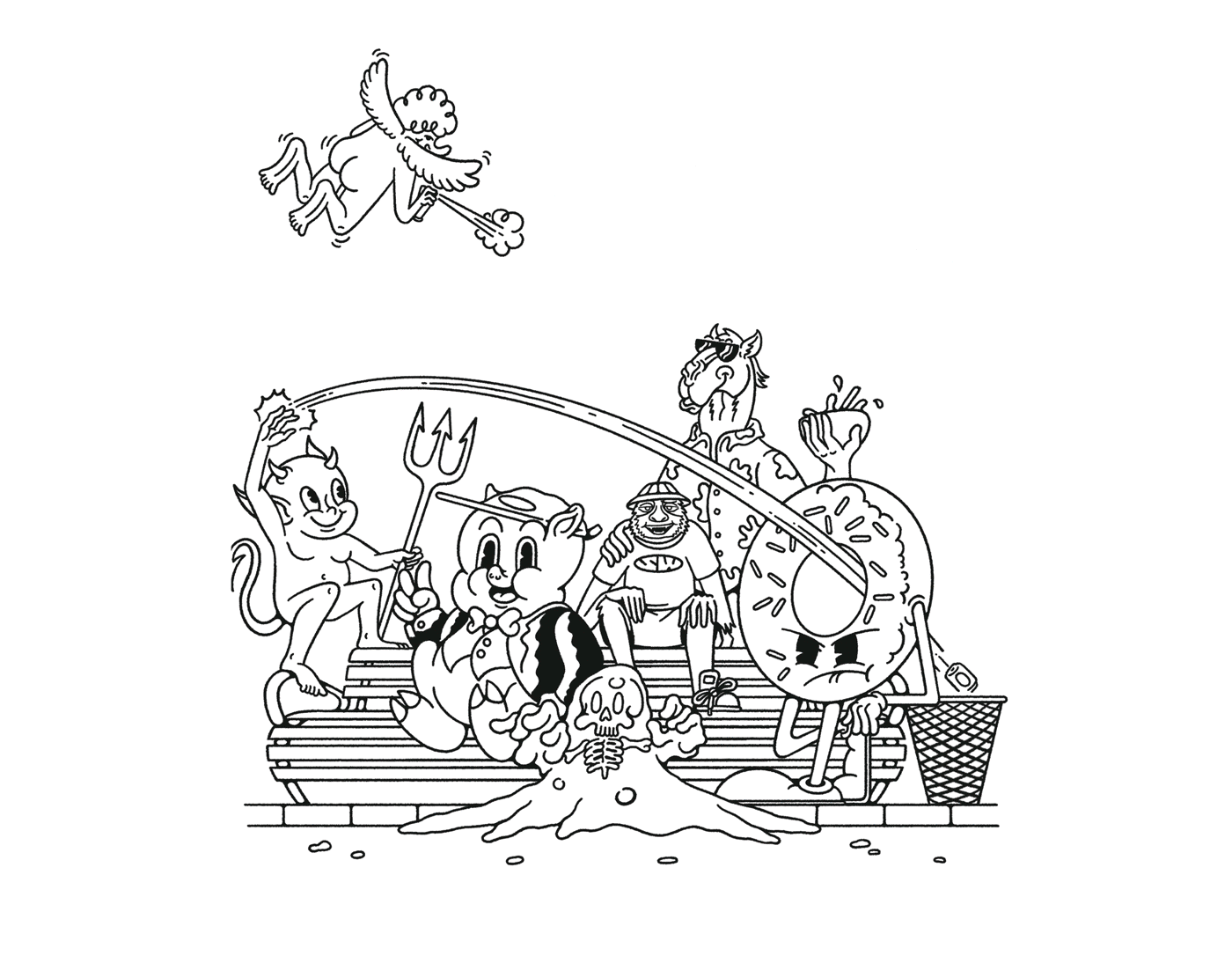 The illustration captures this origin story by representing the characters gathered around the bench where the idea first emerged. Through expressive lines and a vibrant composition, the artwork translates the brand’s playful and spontaneous identity into a graphic that works effectively for apparel design and merchandise.